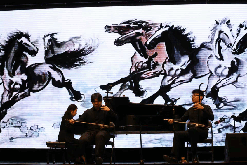 研究生、山东英才学院音乐舞蹈学院青年教师杨宇晨与2024级器乐表演方向本科生安战二胡齐奏《赛马》,激昂有力的旋律感染观众。