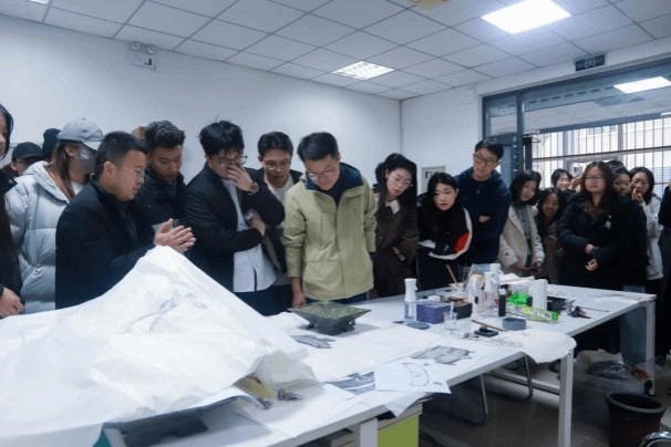 随后参观团队前往B座,实地参观由创新创业学院孵化的济大广可文物保护研究院的文物修复工作现场,依次观看了青铜器修复、文物拓印和书画装裱这三个主要的工作场景,既是对历史文物知识的一次近距离学习和接触,更是对企业孵化落地的一次亲眼见证和现实思考。项目负责人详细介绍了文物保护行业发展技术的革新和发展前景的广阔,为创新创业学院企业孵化落地提供了现实参考。