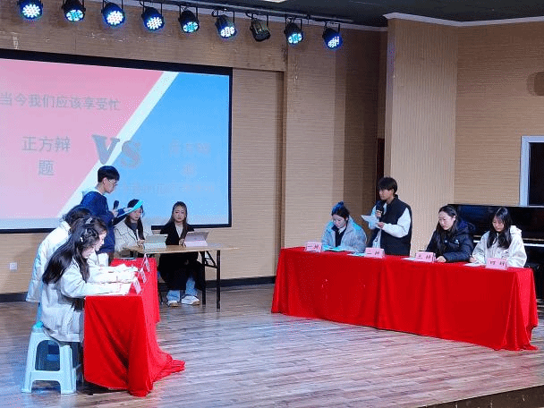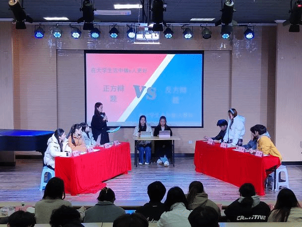 的多支新生队伍踊跃参与,围绕“熬夜利弊”“e人或i人”“忙闲取舍”“盲盒消费”四个贴近青年成长热点的辩题,开启首轮思维交锋。一方结合校园日常与自身经历,用鲜活事例阐释观点,真挚生动;另一方则尝试梳理基础逻辑,从生活现象切入分析,条理清晰。尤其在自由辩论环节,选手们虽偶有临场反应的青涩,却始终保持积极状态,面对质询认真回应,提出疑问时专注执着,即便出现思路衔接的小停顿,也能在队友配合下及时调整,展现出音院新生对思辨的热忱与初步的团队协作意识,更为后续复赛选拔筑牢基础。